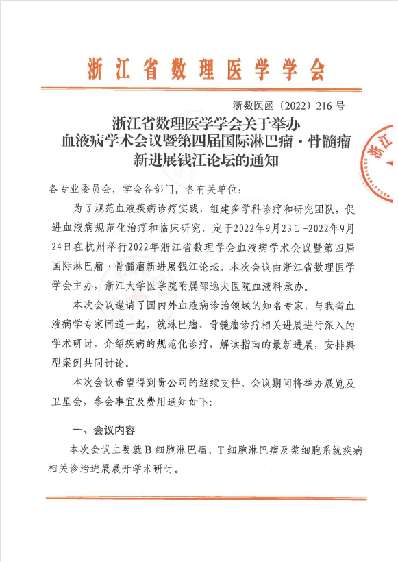 【会议通知】血液病学术会议暨第四届国际淋巴瘤·骨髓瘤新进展钱江论坛